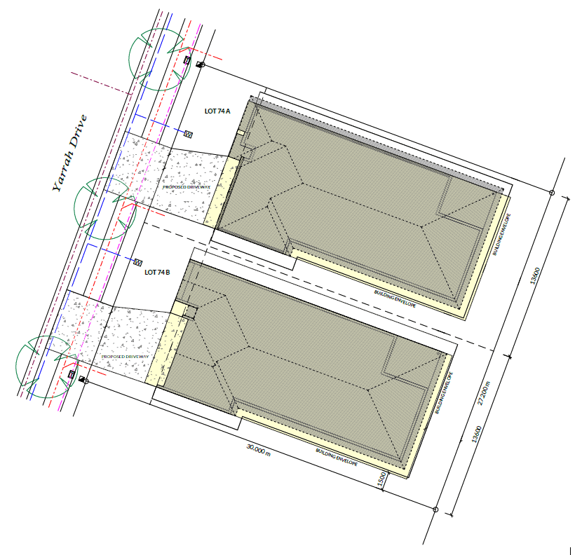 Two detached residential dwellings may be constructed on Lot 74 through the CDC approval process using the NSW Code SEPP. Once two dwellings are built and approved with final occupancy, an application can be made using the NSW Code SEPP to re-subdivide the dwellings into two separate Freehold Title properties.