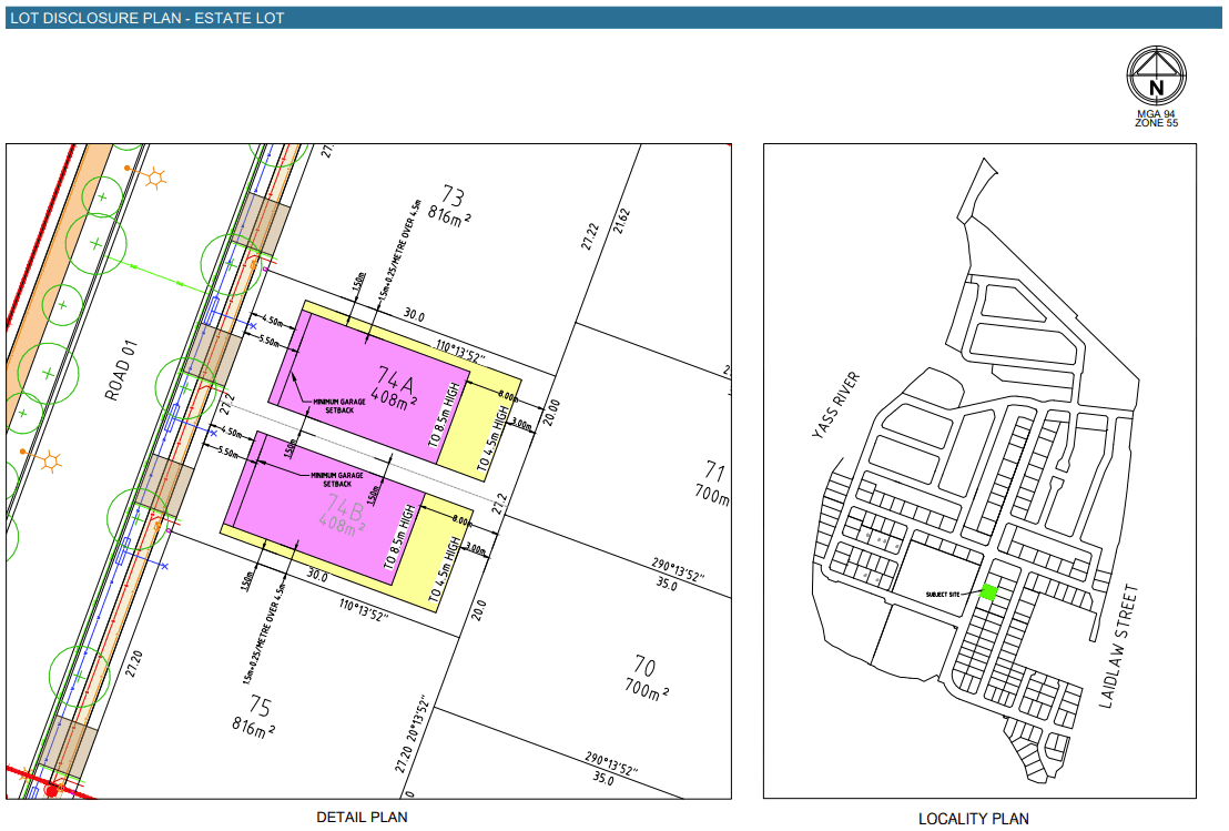 Lot 74 is located on Yarrah drive, opposite Oak Tree Retirement Village and a short walk away from the future Activity Centre, river, parklands, footpaths and cycleways in the charming Yass Valley. The lot faces west and has great northern exposure. It also provides residents with easy access to the established community of Yass, the growing economic centre of Yass Valley.